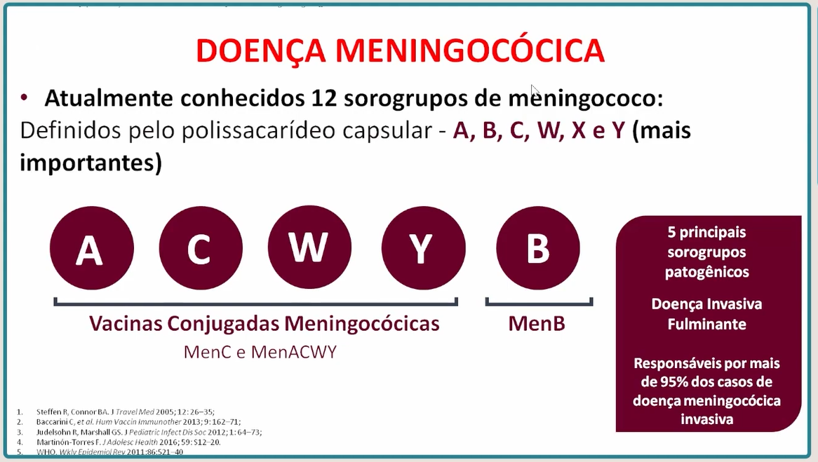 Por último temos as vacinas contra os meningococos, a vacina conjugada ACWY, aplicada aos 3 meses e 5 meses, e uma dose de reforço no segundo ano de vida, depois disso, 5 anos após este reforço, podemos e devemos aplicar um reforço a cada 5 anos, ou seja, aos 7 anos e aos 12 anos de vida, pelo menos ampliar esta proteção em pelo menos mais uma dose aos 17 anos essa vacina, além da proteção contra a invasão do agente, também tira a condição de portador dos adolescentes e adultos jovens. Este fato é importante porque estes indivíduos como são os portadores e não apresentam a doença, podem espalhar o agente entre a população, tanto das crianças menores, como dos idosos.